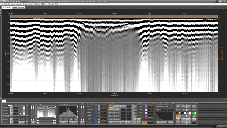 георадиолокационного профиля. В нижней группе вкладок находятся панели