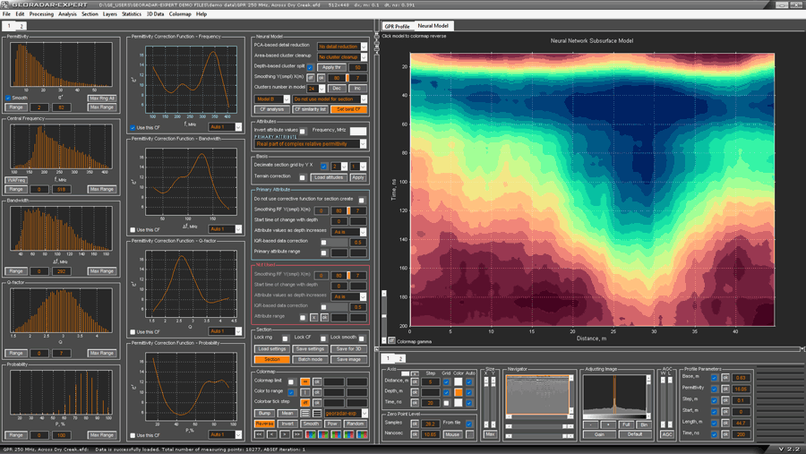 настройки создания разреза и вкладка визуализации нейромодели подповерхностной
