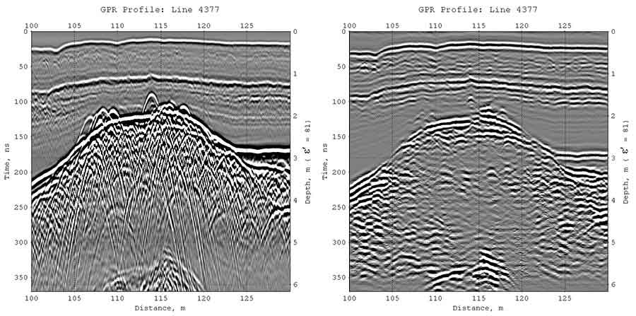 радарограммах, полученных с использованием дипольных низкочастотных антенн,