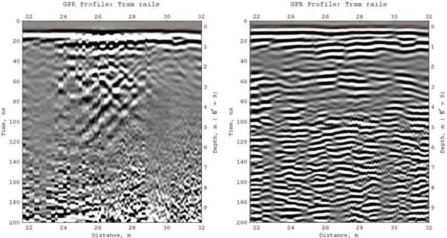 Далее рассматривается георадиолокационный профиль, пересекающий трамвайные пути. Слева показан исходный профиль, где интенсивные отражения от