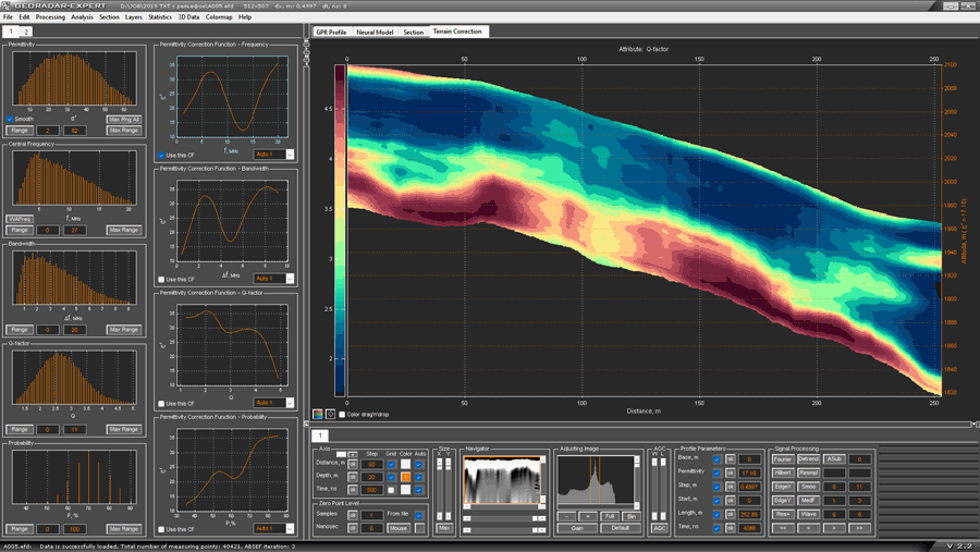 георадиолокационного профиля. В нижней группе вкладок находятся панели